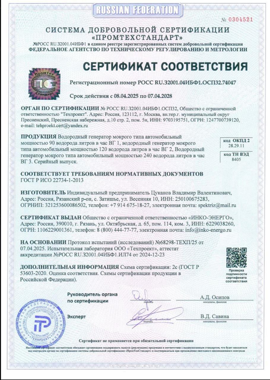 Оборудование H2 System прошло все испытания, имеет патент РФ и полностью безопасно для использования.